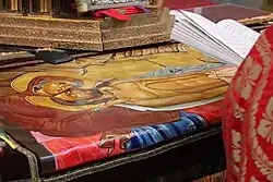 The Epitaphios (Greek: Ἐπιτάφιος, epitáphios, or Ἐπιτάφιον, epitáphion, meaning "upon the tomb"; Slavonic: Плащаница, plashchanitsa; Arabic: نعش, naash) is a Christian religious icon, typically consisting of a large, embroidered and often richly adorned cloth, bearing an image of the dead body of Christ, often accompanied by his mother and other figures, following the Gospel account. It is used during the liturgical services of Holy Saturday in the Eastern Orthodox and Byzantine Catholic churches.