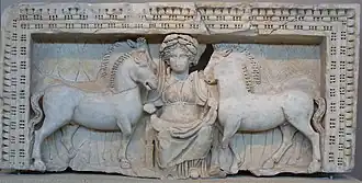 In Gallo-Roman religion, Epona was a protector of horses, ponies, donkeys, and mules. She was particularly a goddess of fertility, as shown by her attributes of a patera, cornucopia, ears of grain, and the presence of foals in some sculptures.[1] She and her horses might also have been leaders of the soul in the after-life ride, with later literary parallels in Rhiannon of the Mabinogion.[2] The worship of Epona, "the sole Celtic divinity ultimately worshipped in Rome itself",[3] as the patroness of cavalry,[4] was widespread in the Roman Empire between the first and third centuries AD; this is unusual for a Celtic deity, most of whom were associated with specific localities.