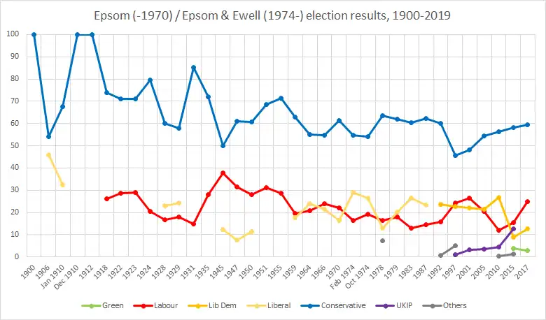 Epsom was a borough constituency represented in the House of Commons of the Parliament of the United Kingdom. It elected one Member of Parliament (MP) by the first past the post system of election. From its creation in 1885 until its abolition in 1974, it was won by eight Conservatives. The winner took less than 50% of the votes in its contested elections once, in 1945, receiving 49.9% of the vote in a three-party contest. Six elections, the last being a by-election in 1912, were uncontested.