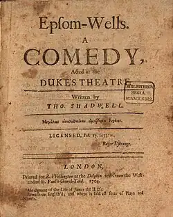 Epsom Wells is a 1672 restoration comedy by the English writer Thomas Shadwell. It was the first in a line of plays set in spa towns.[1] The incidental music was composed by Nicholas Staggins. In the 1690s Henry Purcell scored a new staging of the play. It was performed at the Dorset Garden Theatre by the Duke's Company. The cast included Henry Harris as Rains, Thomas Betterton as Bevil, William Smith as Woodly, Cave Underhill as Justice Clodpate, Anne Gibbs as Lucia, Mary Betterton as Mrs Jilt, James Nokes as Bisket and Edward Angel as Fribble.[2]