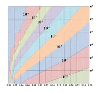 Maximum error of the series expansion of the equation of the center, in radians, as a function of orbital eccentricity (bottom axis) and the power of e at which the series is truncated (right axis). Note that at low eccentricity (left-hand side of the graph), the series does not need to be carried to high order to produce accurate results.