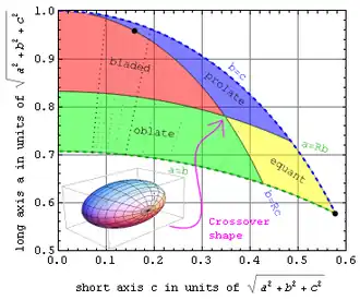 The point of intersection for all four classes on this plot occurs when the object's axes a:b:c have ratios of R2:R:1, or 9:6:4 when R=3⁄2. Make axis b any shorter and the object becomes prolate. Make axis b any longer and it becomes oblate. Bring a and c closer to b and the object becomes equidimensional. Separate a and c further from b and it becomes bladed.