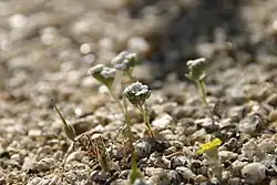 A profusely branching annual herb with very slender, ascending, nearly leafless stems and the leaves are arranged in a basal rosette.[3] The roots and the lower parts of the stems are often stained with a red,[4] or purple hue.[3] The flowers in March–June,[5] are dense racemes, spiciform (spike-shaped) with evenly spaced, leafy-bracteate beneath each flower. The calyx is small and divided into 5 sections from the base. It has a small white corolla. It has 4 ovules and 4 nutlets (which appear after flowering), which are similar in size and shape. The gynobase (a short conical or flat elevation of the receptacle of a flower, bearing the gynoecium) is thin and columnar, they are nearly similar (in form) to the wide style, which is dilated and wider that the stigma when in fruit.[3]