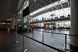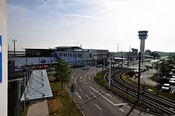The airport consists of one passenger and one business terminal. The passenger terminal features two aircraft parking positions and four boarding gates on two levels, the upper ones are equipped with jet bridges. There are also some shops and restaurants, a visitors terrace as well as travel and rental car agencies inside the terminal.[9] The apron also features several additional bus-boarding stands for mid-sized aircraft such as the Boeing 737.