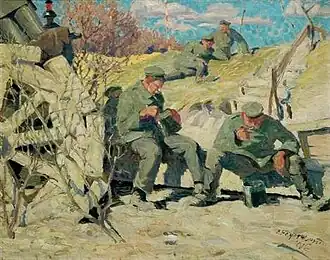 In 1938, he was appointed head of the woodcutting class at the State Academy of Fine Arts in Stuttgart, succeeding Gottfried Graf, whose works had been deemed "Degenerate".[2] From then until 1944, he was represented at all the major art exhibitions, including the Große Deutsche Kunstausstellung, which featured Nazi-approved art. In 1943, he was officially welcomed to an exhibit in Kraków by the head of the General Government, Hans Frank, who came to be known as the "Polish Butcher".[1]