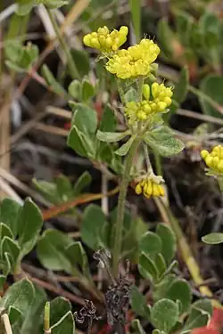 It is an extremely variable plant and hard to identify because individuals can look very different from one another. Also, there are many varieties. It may be a perennial herb blooming by summer[1] with stems 10 centimetres (4 in) tall and two to six clusters of flowers, with a whorl of leaves below the stems,[1] or a sprawling shrub approaching 2 metres (6+1⁄2 ft) high and wide. The leaves are usually woolly and low on the plant, and the flowers come in many colors from white to bright yellow to purple.