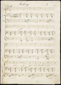 Schubert composed "Erlkönig" at the age of 18 in 1815 – Joseph von Spaun claims that it was written in a few hours one afternoon.[5] He revised the song three times before publishing his fourth version in 1821 as his Opus 1. The work was first performed in concert on 1 December 1820 at a private gathering in Vienna. The public premiere on 7 March 1821 at the Theater am Kärntnertor was a great success, and quickly propelled the young composer to fame in Vienna.[4][6]