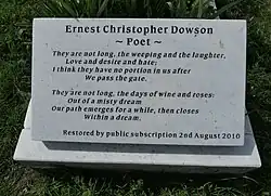 - In anticipation of the anniversary of Dowson's birth on 2 August 2010 his grave, which had fallen derelict and been vandalised, was restored. The unveiling and memorial service were publicised in the South London Press, on BBC Radio 4 and in the Times Literary Supplement, and dozens of people paid tribute to the poet 110 years after his death.