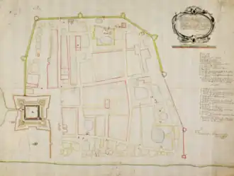 According to the Indian Associate Professor of History Dr. N. Sethuraman, Kongsbakke built a wall around the town of Tranquebar to more easily protect it.[7] However, Danish historian and department librarian, Bjørn Westerbeek Dahl, doubts this, as he considers the fortification methods to old to be used in the 1600s. Instead, Dahl suggests the fortification could have been built in the 1640s during Willem Leyel's tenure or possibly in the 16th century by the Portuguese.[11] At any rate, the wall existed at least in the mid-1660s, and colonial officials were thereby given the opportunity to settle outside the walls of the Fort Dansborg. To that, Kongsbakke built a yard facing Kongsgade (King's Street).[6]
