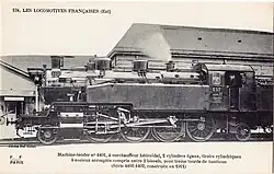 Est 4401 to 4512 were a class of Mikado (2-8-2) tank locomotives which were designed for service on the Paris suburban lines of the Compagnie des chemins de fer de l'Est.[1] The Est placed them in power class (série) 11s. On nationalisation in 1938 they passed to the SNCF, who renumbered them 1-141.TB.401 to 1–141.TB.512.