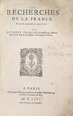 - Huppert, George, The Idea of Perfect History: Historical Erudition and Historical Philosophy in Renaissance France. (Urbana: University of Illinois Press, 1970) - See the chapter on Pasquier p28-71.