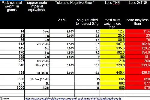 The tolerable negative error is related to the nominal quantity and varies between 9 per cent on prepackages nominally 50 g or 50 ml or less, to 1.5 per cent on prepackages nominally 1 kilogram or 1 litre or more. The tolerable error decreases as nominal quantity increases, and is done by alternating intervals where there is a percentage error and intervals where there is a fixed error (and thus over those intervals the percentage error decreases).