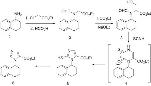 2-Aminotetralin () is alkylated with ethylchloroacetate to afford the glycine derivative. Heating with formic acid then affords the amide (2). This compound is then reacted with ethyl formate to yield hydroxymethylene ester (3). Reaction with isothiocyanic acid gives the imidazole-2-thiol (5). The sequence may first involve hydrolysis of the formamido group, followed by addition of the amine to isothiocyanic acid; cyclization of the thiourea nitrogen with the formyl function would complete formation of the heterocycle. Desulfurization by means of Raney nickel finishes the synthesis of ethonam (6).