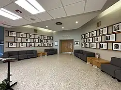 A limestone cenotaph (War Memorial - Etobicoke Municipal Centre) was constructed in 1968 in memory of those who gave their lives in World War I (1914 - 1918), World War II (1939 - 1945), and the Korean War (1950 - 1953).[2] The original plan was to convert the clock tower as a cenotaph. The war dates are located on a metal plaque and above it a large metal cross. Adjacent to the Cenotaph, a provincial plaque commemorating Corporal Frederick George Topham, V.C., an Etobicoke war Hero was erected in 1980.[3] The Board of Education (1 City Centre Court) and Ontario Hydro (South Block) built structures next to the Civic Centre, the former was acquired by Etobicoke for civic use in 1969. In 1973 an addition was added to the original by the same architectural firm.[1]
