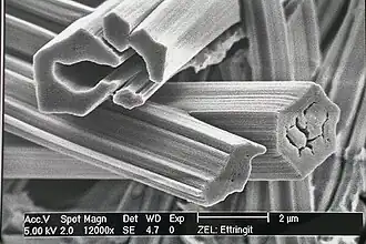 Ettringite is a hydrous calcium aluminium sulfate mineral with formula: Ca6Al2(SO4)3(OH)12·26H2O. It is a colorless to yellow mineral crystallizing in the trigonal system. The prismatic crystals are typically colorless, turning white on partial dehydration.[3][4] It is part of the ettringite-group which includes other sulfates such as thaumasite and bentorite.[5]
