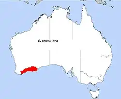 Eucalyptus tetraptera, commonly known as square-fruited mallee or four-winged mallee,[2] is a mallee that is endemic to the south coast of Western Australia. It has smooth bark, thick lance-shaped to oblong adult leaves, single flower buds arranged in leaf axils, red to pink flowers and square, prominently winged fruit.
