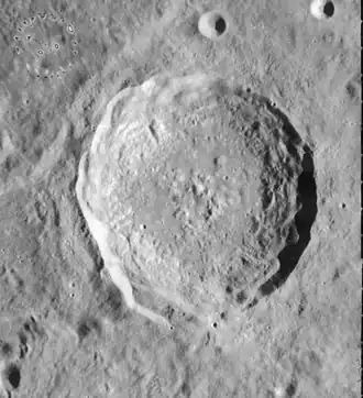 Eudoxus is a prominent lunar impact crater that lies to the east of the northern tip of the Montes Caucasus range. It is named after the Greek astronomer Eudoxus of Cnidus.[1] It is located to the south of the prominent crater Aristoteles in the northern regions of the visible Moon. To the south is the ruined formation of Alexander, and the small crater Lamèch lies to the southwest.