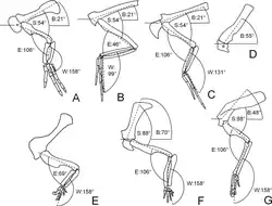 Like most paravians, eudromaeosaurs possessed a highly derived semilunate carpal formed by the co-ossification of the three distal-most carpal bones. This condition allows for the hand to be folded flat against the ulna in order to hold their wings close to the body.[45] The resting position of the elbow would likely have been an extremely acute angle for eudromaeosaurs, with the wings held close to the body, but not fully folded in the manner of modern birds.[46]