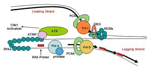 - ^ Byun TS, Pacek M, Yee MC, Walter JC, Cimprich KA (May 2005). "Functional uncoupling of MCM helicase and DNA polymerase activities activates the ATR-dependent checkpoint". Genes & Development. 19 (9): 1040–52. doi:10.1101/gad.1301205. PMC 1091739. PMID 15833913.
