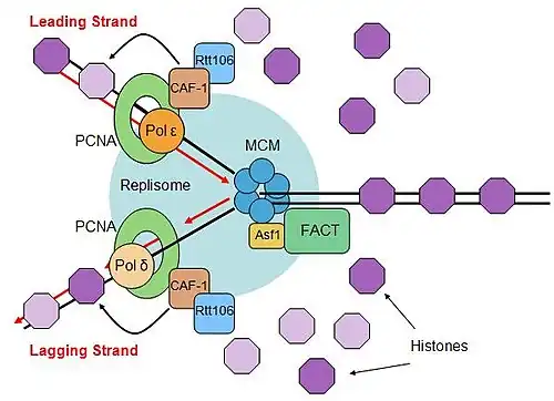 - ^ Gasser R, Koller T, Sogo JM (May 1996). "The stability of nucleosomes at the replication fork". Journal of Molecular Biology. 258 (2): 224–39. doi:10.1006/jmbi.1996.0245. PMID 8627621.