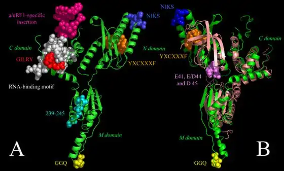 - ^ a b c d e Song H, Mugnier P, Das AK, Webb HM, Evans DR, Tuite MF, et al. (February 2000). "The crystal structure of human eukaryotic release factor eRF1--mechanism of stop codon recognition and peptidyl-tRNA hydrolysis". Cell. 100 (3): 311–321. doi:10.1016/s0092-8674(00)80667-4. PMID 10676813.