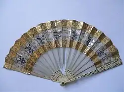Sticks and handles could be made of gold, tortoise shell, ivory, mother-of-pearl, horn, or wood. They were often highly decorated. Most sticks and handles were not only made of the previously listed materials, but were inlaid with others. For example, a mother-of-pearl fan could be inlaid with gold. Other sticks were plain.[4]