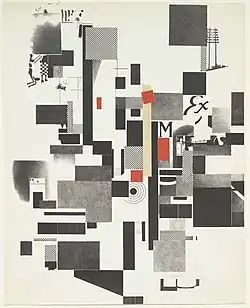 The next of the new styles was dadaism, a movement of reaction to the disasters of World War I, which involved a radical approach to the concept of art, which loses any component based on logic and reason, and claims the doubt, chance, the absurdity of existence. This translated into a subversive language, where both the themes and the traditional techniques of art were questioned, experimenting with new materials and new forms of composition, such as collage, the photomontage and the readymade.[47] Among its representatives is Jean Arp, painter, sculptor and poet, one of the founders of the movement in Zürich. In 1916 he illustrated Tristan Tzara's 25 Poems and made the woodcut series Symmetry Studies, of abstract cut. Since then he continued to produce etchings and, above all, woodcuts, with a sober style in carving and sharp in ink, with images that move between abstraction and morphology. He also illustrated his own texts: Sailboat in the forest (1957), 1, rue Gabrielle (1958), Towards the infinite white (1960).[48] Also notable was Kurt Schwitters, who produced in 1923 a series of six lithographs of his work Merz, in a numbered edition of fifty copies. He elaborated it on papers of different colors, so it obtained a certain appearance of collage.[49] Another exponent was Christian Schad, a contributor to the magazine Sirius, for which he produced one woodcut per issue, and for whose publisher he created a booklet of ten woodcuts in 1915.[50]