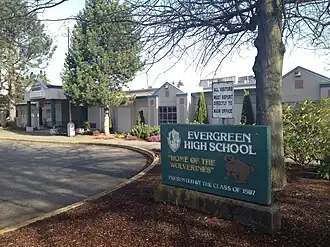 Evergreen High School is a public high school in the Highline School District and located in White Center, an unincorporated area of King County, Washington. The school is located just south of the heavily polluted Hicklin Lake. Evergreen High School's mascot is the wolverine.[2]