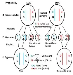 Sexual reproduction implies that chromosomes and alleles segregate and recombine in every generation, but not all genes are transmitted together to the offspring.[37] There is a chance of spreading mutants that cause unfair transmission at the expense of their non-mutant colleagues. These mutations are referred to as "selfish" because they promote their own spread at the cost of alternative alleles or of the host organism; they include nuclear meiotic drivers and selfish cytoplasmic genes.[37] Meiotic drivers are genes that distort meiosis to produce gametes containing themselves more than the 50% of the time expected by chance. A selfish cytoplasmic gene is a gene located in an organelle, plasmid or intracellular parasite that modifies reproduction to cause its own increase at the expense of the cell or organism that carries it.[37]