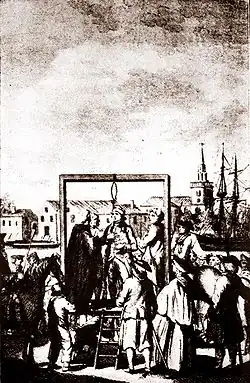 With a particular cruelty reserved for those convicted of acts of piracy, hanging was done with a shortened rope.[1] This meant a slow death from strangulation on the scaffold as the drop was insufficient to break the prisoner's neck. It was called the Marshal's dance because their limbs would often be seen to 'dance' from slow asphyxiation. Unlike hangings on land, such as at Tyburn, the bodies of pirates at Execution Dock were not immediately cut down following death. Customarily, these corpses were left hanging until at least three tides had washed over their heads. This practice stopped at the end of the 18th century. In the cases of the most notorious offenders, the Admiralty would order that their bodies be tarred and hung in chains at either Cuckold's Point or Blackwall Point, on the River Thames, as a warning to all seafarers of the fate awaiting those who turned to piracy.[2]