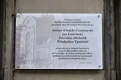 - 27/35 Marszałkowska Street – in the 1950s, a plaque designed by Karol Tchorek was unveiled on the front wall of the building, commemorating the residents of the houses on Marszałkowska Street murdered by the Germans in the first days of August 1944. In later years, another plaque was installed, commemorating the scouts from the Mokotów Grey Ranks who were executed at this site.[44]