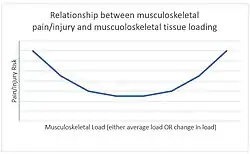 The lifetime prevalence of hip and knee osteoarthritis is 13% for competitive runners, 10% for non-runners, but only 4% for moderate social runners, demonstrating a U-shaped curve between running load and arthritis risk (high and low dose = higher risk; moderate load = lower risk).[40] With respect to back pain, increasing levels of exercise reduce risk of back pain,[41] but having occupational manual loading increases the risk.[42] The bottom of the U-shaped curve for injury risk and loading is sometimes referred to as the Goldilocks zone (not too little exercise but not too much).[43][44][45] There also may be a Goldilocks zone for physical activity and all-cause mortality, but at a very high level and with an eccentric U-shape (that is, low exercise levels are far riskier for all-cause mortality than extremely high exercise levels).[46]