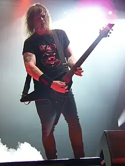 Exodus is an American thrash metal band formed in 1979 in Richmond, California.[1] Their current lineup consists of guitarists Gary Holt and Lee Altus, bassist Jack Gibson, drummer Tom Hunting, and lead vocalist Rob Dukes. Notable former members include vocalists Paul Baloff and Steve "Zetro" Souza, drummers John Tempesta and Paul Bostaph, and founding guitarist Kirk Hammett who later joined fellow Bay Area thrash metal band Metallica. There are no original members left in Exodus other than Hunting, who had departed from the band twice, in 1989 and 2004, but rejoined in 2007. Holt, who has been in the band since 1981, is the only member to appear on all of Exodus' recordings. Much of the band's career has been affected by lineup changes, feuds between both band members and record companies, two extended hiatuses, deaths of former band members, and drug addictions.[2]