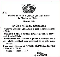 On 12 May Garibaldi left Marsala and advanced quickly and easily towards the interior of Sicily. In the following days, a thousand Sicilian volunteers joined the expedition, including Franciscan priests. The volunteers are grouped within a new military structure, the Hunters of Etna,[68] directed by Giuseppe La Masa.[69] On 14 May 1860 in Salemi, after an enthusiastic welcome which reassured him of the participation of the population, Garibaldi declared to ensure the dictatorship of Sicily in the name of King Victor Emmanuel II, which would then come later.[68]