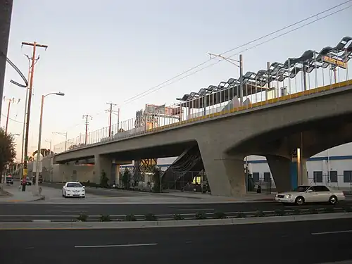 Expo/La Brea station is an elevated light rail station on the E Line of the Los Angeles Metro Rail system. The station is located over the intersection of Exposition Boulevard and La Brea Avenue, after which the station is named, in the West Adams neighborhood of Los Angeles.[3]