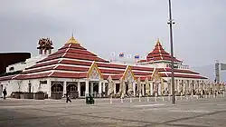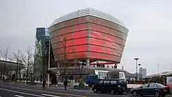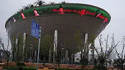 Three of the five theme pavilions were located in the Central Exhibition Building constructed by the host country. Covering an area of 11.5 hectares, it is the largest exhibition structure in the history of World Expositions.[6] The building was located near the Expo Axis, in Zone B. The total exhibition space of this building was 80,000 m2. A 7,000 m2 multifunctional room in the building's center had an atrium in which some of the individual pavilions opened. Construction was completed in September 2009 before interior construction began.[7]
