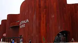 The three-story Australia Pavilion was constructed on a 4,800 m2 site and designed by leading Australian architectural firm Wood Marsh[21] in conjunction with creative design firm Think!OTS.[22][23] The façade of the structure was composed of weathered steel, which oxidized in the months preceding the expo's opening.[23] The red ochre color was meant to represent the "red center" desert regions of central Australia.[23]