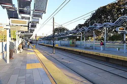 Expo Park/USC station is an at-grade light rail station on the E Line of the Los Angeles Metro Rail system in Los Angeles, California, United States. The station is located in the center median of Exposition Boulevard near entrances to Exposition Park (Expo Park) and the University of Southern California (USC), after which the station is named.[2] The 37th Street/USC station for the J Line of the Los Angeles Metro Busway system is located a few blocks east of the station.