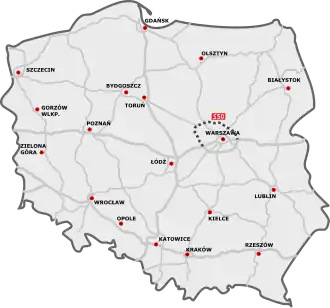 The S50 expressway is a planned expressway in Poland, in Masovian Voivodeship. It will run as a circle road north to the Warsaw metropolitan area to take over the transit traffic from the existing expressway ring around the city, mainly from the S8 and S17 expressways, as well as will be one of the road connectors to the planned Solidarity Transport Hub.[1] It was added to the motorway and expressway index by Polish government on 24 September 2019.[2]