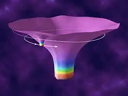 In astrophysics, an extreme mass ratio inspiral (EMRI) is the orbit of a relatively light object around a much heavier (by a factor 10,000 or more) object, that gradually spirals in due to the emission of gravitational waves. Such systems are likely to be found in the centers of galaxies, where stellar mass compact objects, such as stellar black holes and neutron stars, may be found orbiting a supermassive black hole.[1][2][3] In the case of a black hole in orbit around another black hole this is an extreme mass ratio binary black hole. The term EMRI is sometimes used as a shorthand to denote the emitted gravitational waveform as well as the orbit itself.