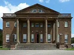The second Grade I listing includes Berrington Hall and its laundry, dairy and stable outbuildings surrounding the north-east courtyard. The hall is a neoclassical English country house dating to 1778 - 1781, designed by Henry Holland for Thomas Harley, a banker and Lord Mayor of London who had bought the Berrington estate in 1775. The building is of pink sandstone ashlar construction with a portico supported by Ionic columns. The present parkland was laid out by Capability Brown, which includes the 14 acres (5.7 ha) Berrington Pool lake and island. Berrington hall, listed in 1959, is a National Trust property.[36][37][38] The third Grade I building is Eye Manor, a 17th-century country house built for Ferdinando Gorges, which stands 30 yards (27 m) north-west from St Peter and St Paul's Church. The building is of red brick, two parallel roof ridges, and of two storeys with cellar and attics. The eastern front fascia has a central Doric portico entrance, and is of five bays with sash windows. Three roof dormer windows reflect the central three bays. Significant are the interior fixtures and fittings, particularly the ceilings in ornamental plaster-work hand modelled with naturalistic elements.[39][40]