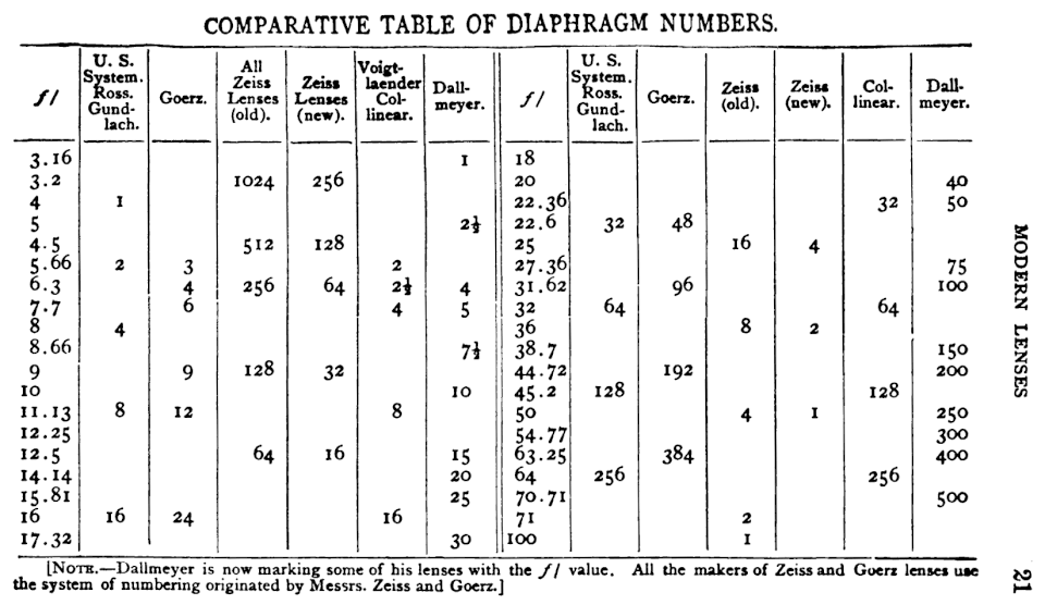 By 1895, Hodges contradicts Bothamley, saying that the f-number system has taken over: "This is called the f/x system, and the diaphragms of all modern lenses of good construction are so marked."[29]