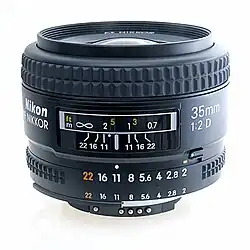 An f-number is a measure of the light-gathering ability of an optical system such as a camera lens. It is defined as the ratio of the system's focal length to the diameter of the entrance pupil ("clear aperture").[1][2][3] The f-number is also known as the focal ratio, f-ratio, or f-stop, and it is key in determining the depth of field, diffraction, and exposure of a photograph.[4] The f-number is dimensionless and is usually expressed using a lower-case hooked f with the format f/N, where N is the f-number.