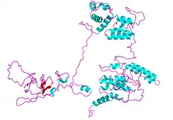 The subcellular location of the protein is the nucleus.[13] There is a leucine zipper pattern in the protein beginning at amino acid 347.[14]