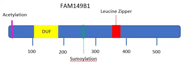 The primary protein encoded by the FAM149B1 gene is 583 amino acids in length and has a molecular weight of 64 kDal. The protein contains a conserved protein domain, DUF3719[8][6] located at the amino acids 115–179. The isoelectric point of the protein before post-translational modifications is 6.3,[9] and this isoelectric point is relatively conserved in the protein's isoforms, especially in those with the most similar composition of exons. This protein is considered serine rich, in that it expresses a higher serine composition relative to the composition of other human proteins.[10][11] This high serine composition is also seen in the gene's orthologues.