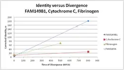 There is one known paralog, FAM149A.[27] It is located on the human chromosome 4 at 4q35.1. The function of the protein encoded by this gene is not well understood, but it also contains the DUF3719 protein domain. The protein translated by this gene shares a 21.2% identity[28] with the FAM149B1 protein. The protein sequence is 482 amino acids in length.