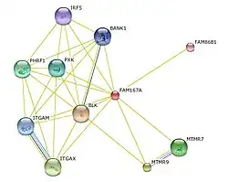 Using the MINT, STRING, and IntAct tools on Genecards, the sources have a consensus on the interactions between FAM167A and BANK1 as well as the BLK gene.[15] These proteins are already known to interact with FAM167A in the development of several diseases such as Sjogren's disease and systemic sclerosis. In both the case of BANK1 and BLK, there is literature to back up the possible connections and interactions between the two proteins in disease development.