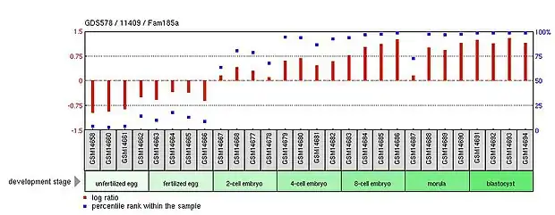 While little data is currently available on differential expression in humans, FAM185a expression is greatly decreased in ROR1-alpha knockout mice and toll-like receptor 5 knockout mice.[13] Mice also show a decrease in FAM185a expression in tissues that have been treated with Reversine, indicating the protein's potential role relates to stem cell differentiation during development.[13] GEO profiles for mice also show that FAM185a expression begins after fertilization, and continues to be high throughout embryonic development.[13]