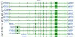The mRNA of the most common peptide (variant x2) is 8699 nucleotides long and includes 22 exons.[10][11][12][13][14]