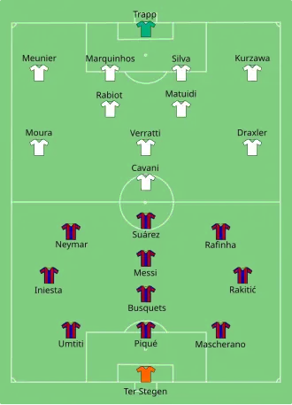 Ángel Di María put the Parisians in front on 18 minutes with a free kick after Barcelona's Samuel Umtiti committed a foul. Julian Draxler made it 2–0 with a low shot in the 40th minute, assisted by Marco Verratti. After 55 minutes, Di María scored once again from a shot outside the box. Edinson Cavani scored the final goal of the game in the 72nd minute, securing the 4–0 win. Barcelona achieved only one shot on target during the whole match.[10]